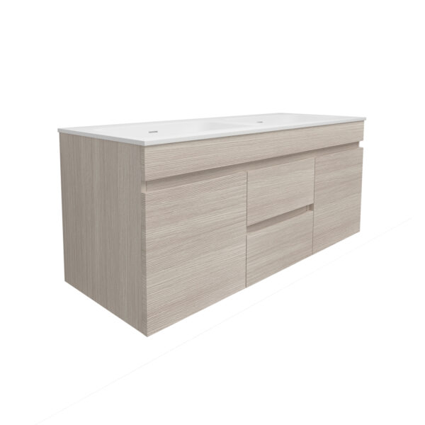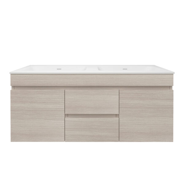 The Camden Modern Wall Hung Cabinet in Coastal Oak is crafted for dual bowl setups, offering maximum functionality and style. Its moisture-resistant PVC construction ensures durability, while the natural Coastal Oak finish provides a warm, modern touch.
