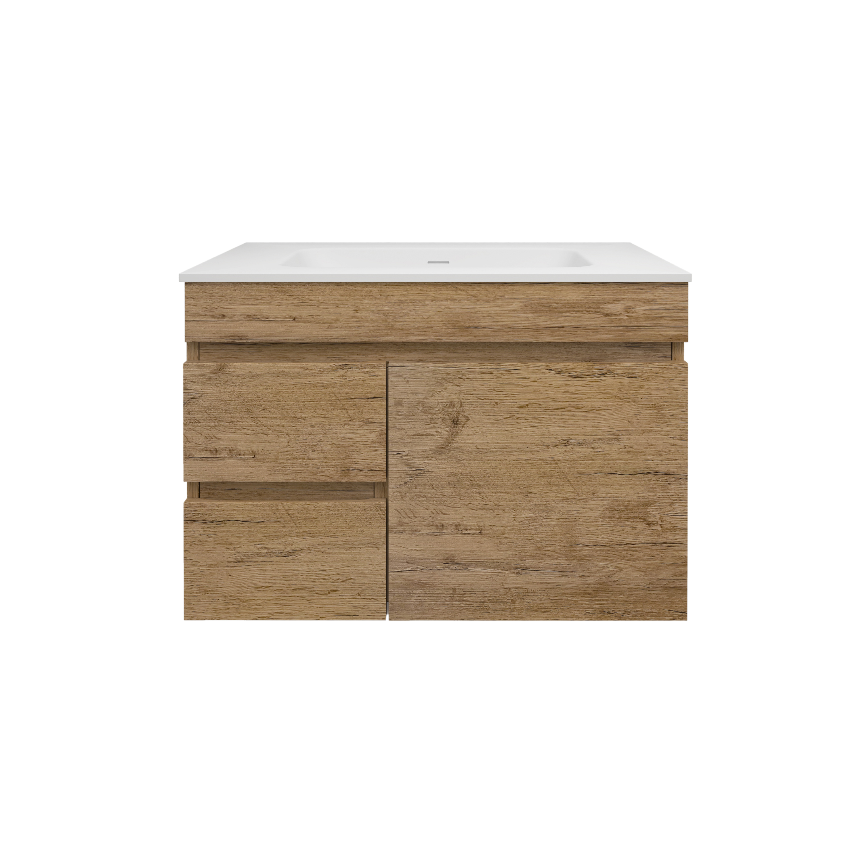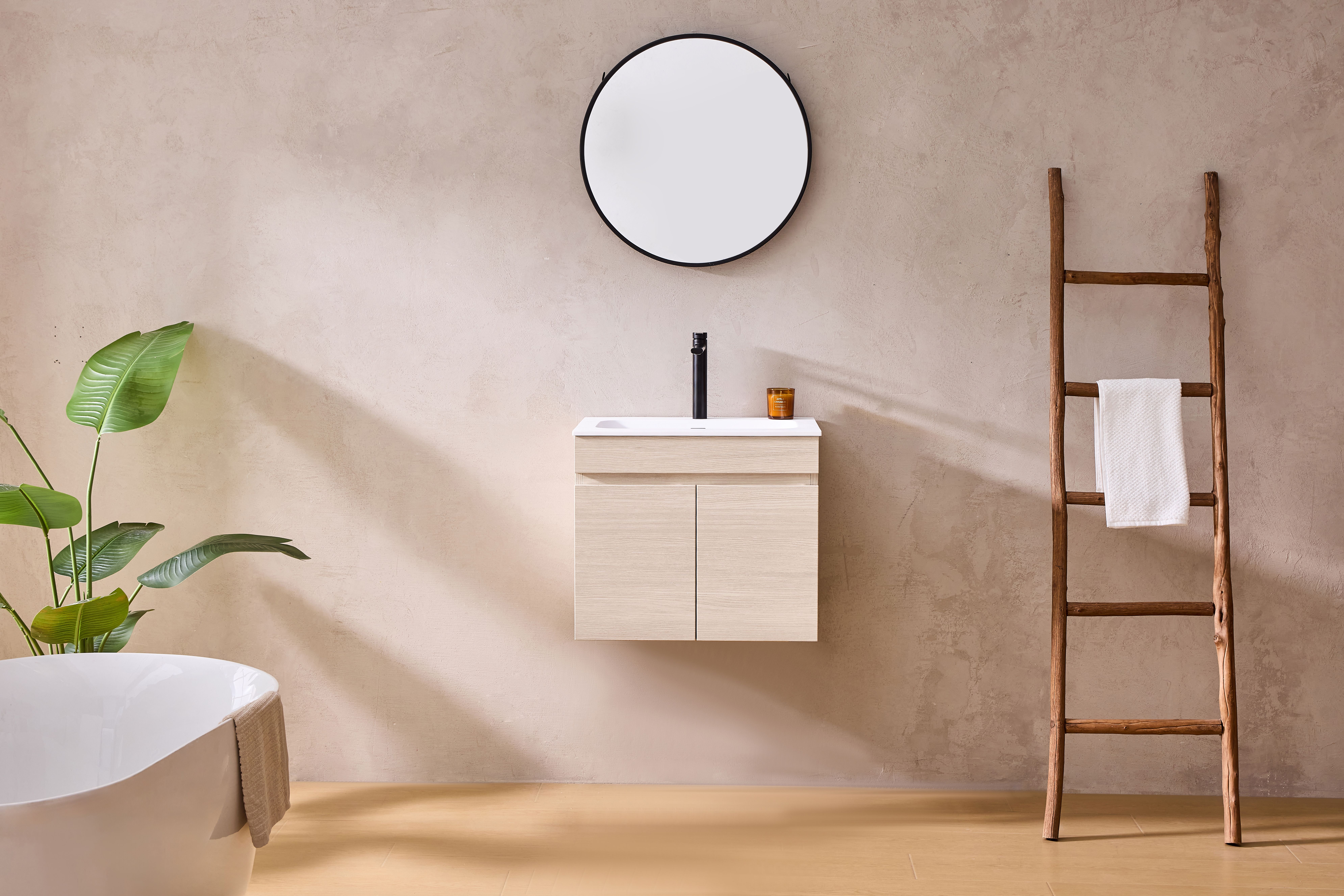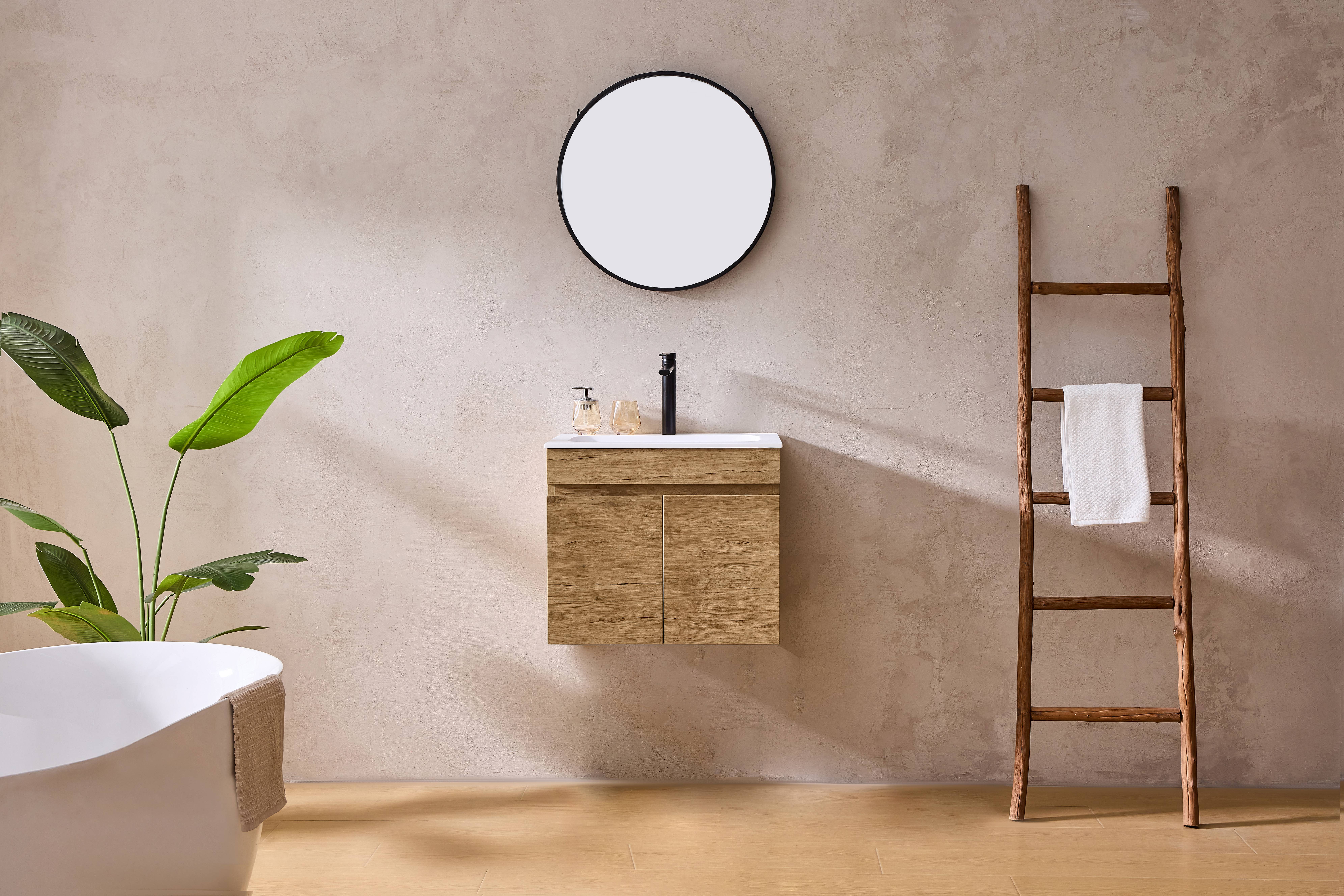 The Camden Modern Wall Hung Cabinet in Coastal Oak is a stylish single bowl option with a subtle wood grain finish. Made from water-resistant PVC, it blends modern design with practical storage.