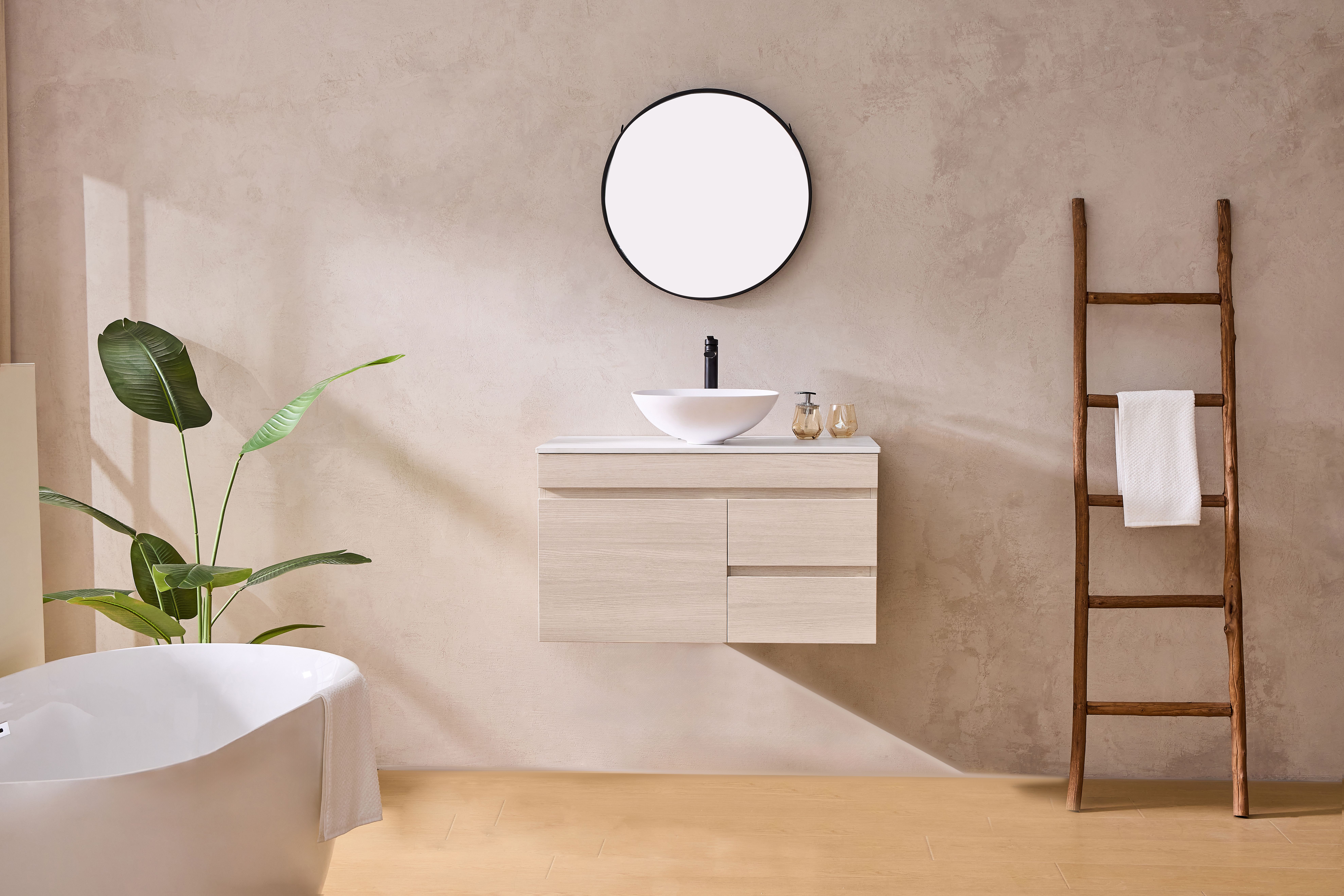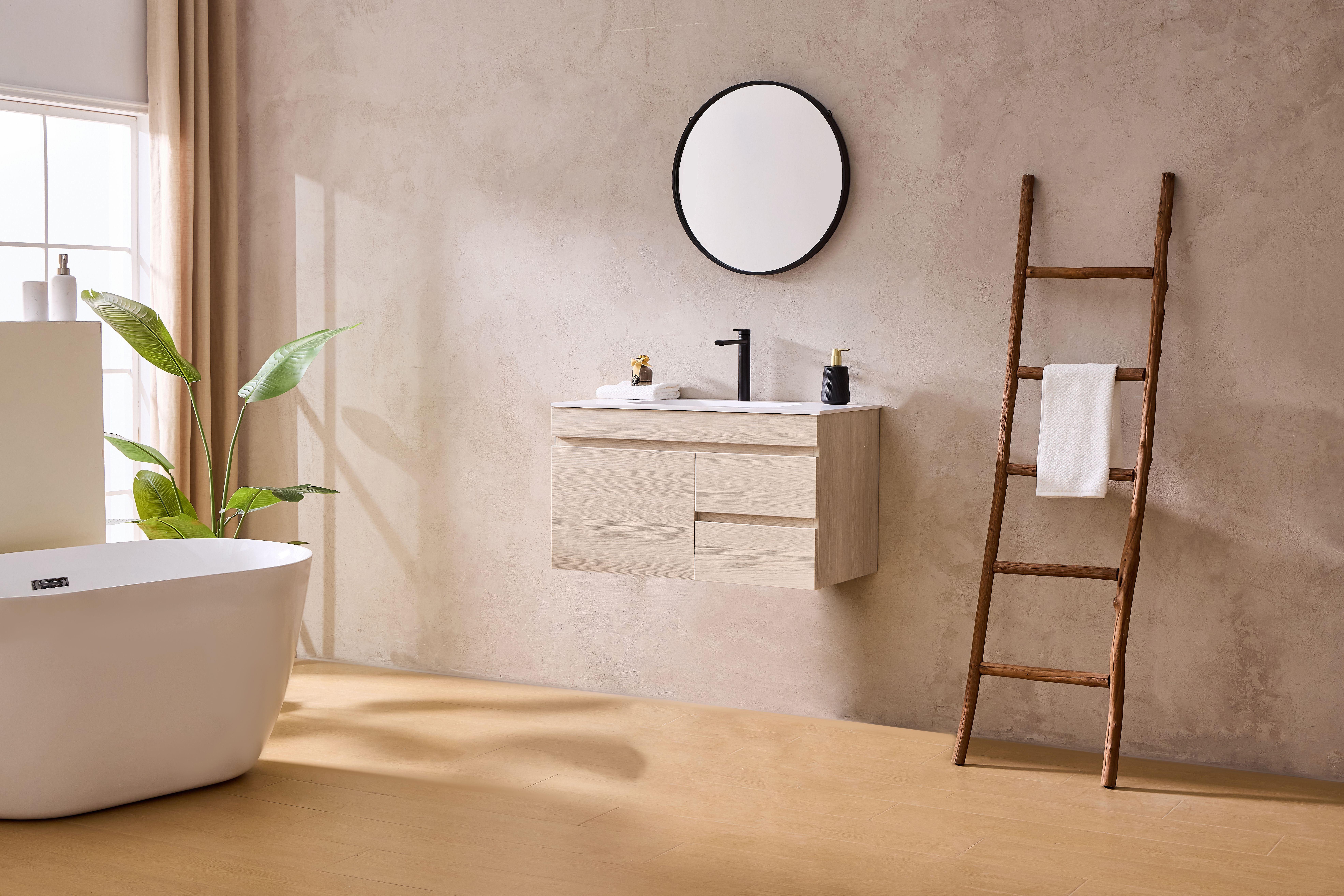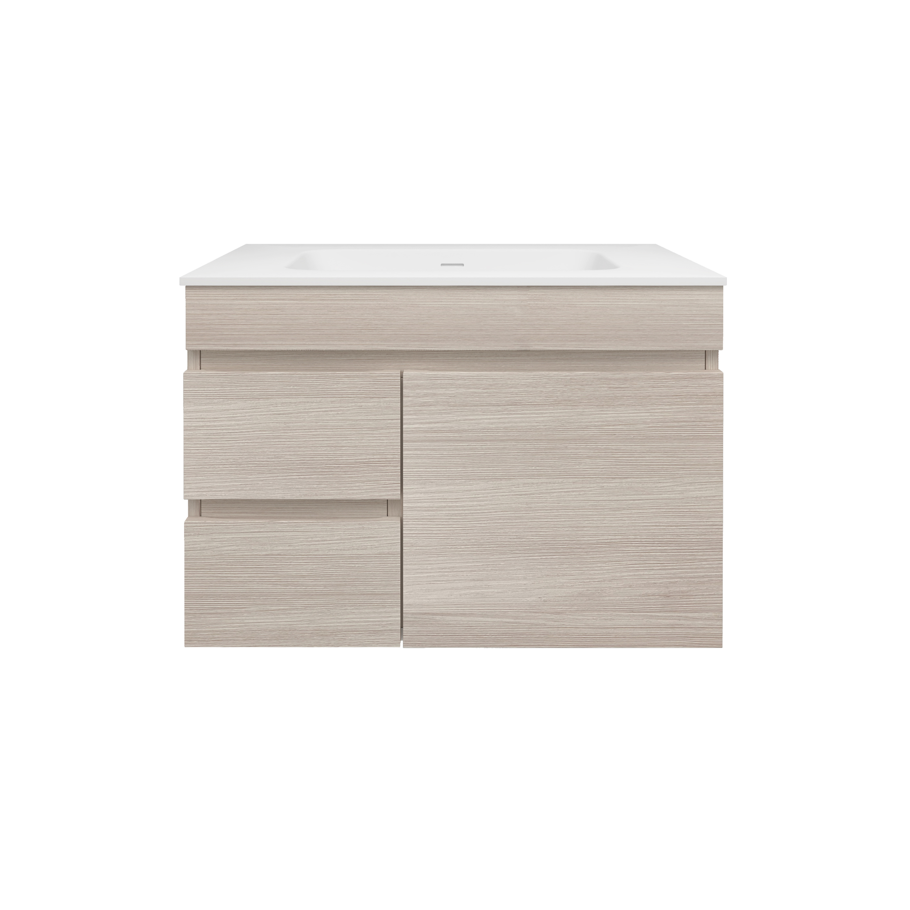 The Camden Modern Wall Hung Cabinet in Coastal Oak is a stylish single bowl option with a subtle wood grain finish. Made from water-resistant PVC, it blends modern design with practical storage.