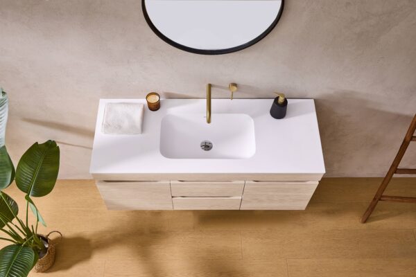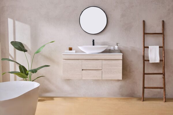 The Camden Modern Wall Hung Cabinet in Coastal Oak is a stylish single bowl option with a subtle wood grain finish. Made from water-resistant PVC, it blends modern design with practical storage.