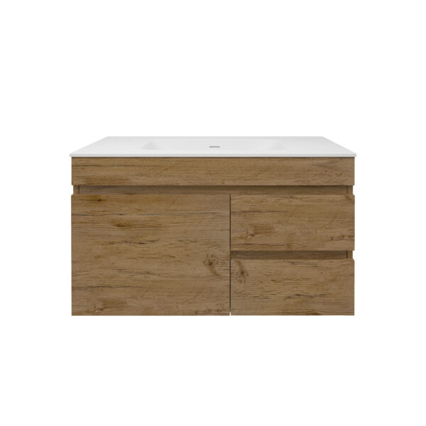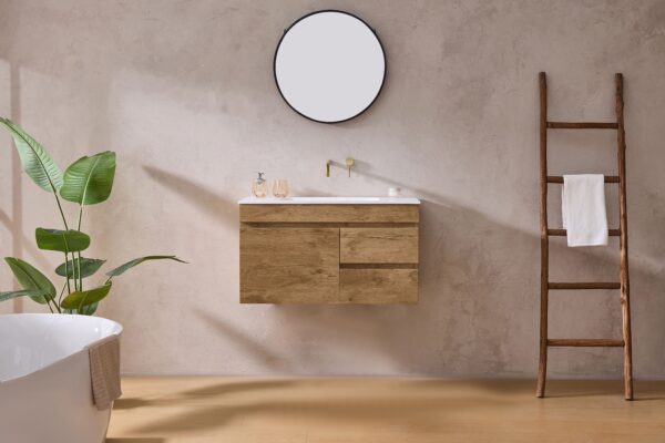 The Camden Modern Wall Hung Cabinet in Prime Oak combines elegant wood tones with practical storage. Featuring two soft-close right-hand drawers and a left-side door, it is crafted from high-quality Wood Grain PVC and finished in Prime Oak for a refined and modern look. Perfect for bathrooms requiring both style and functionality.